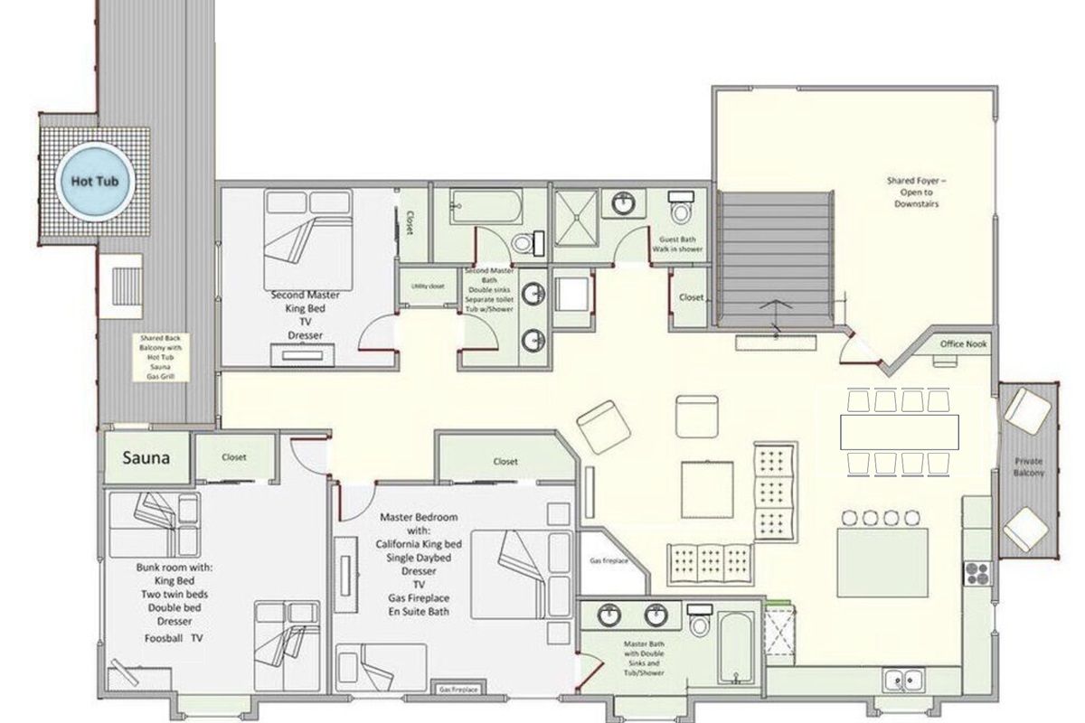 Two private primary bedrooms provide comfort and separation for adult guests. The main primary features a California king bed, daybed, fireplace, and en-suite bath with dual sinks and a tub/shower combination. The second primary includes a king bed, TV, and is adjacent to a bathroom with dual sinks and a separate toilet/shower room. The third bedroom is a bunkroom designed with fun in mind, offering two sets of bunks (sleeping up to six), a TV, and mini-foosball—perfect for kids or teens while adults relax nearby.